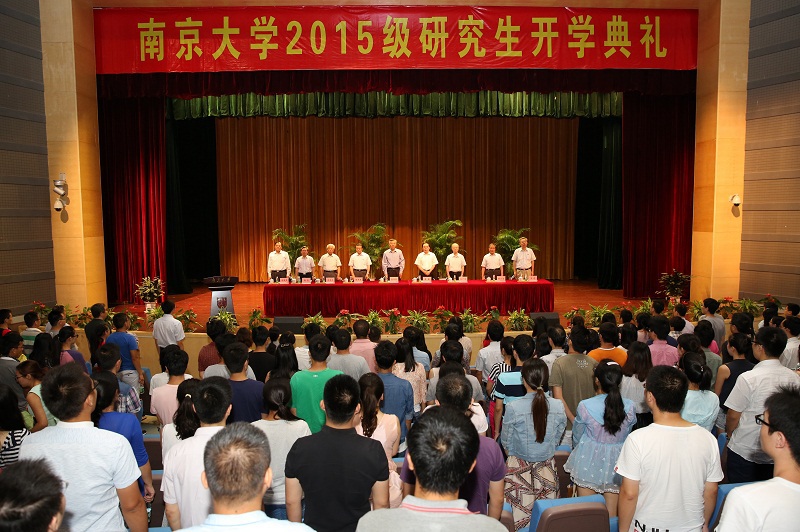 9月9日上午,南京大学2015级研究生入学典礼在仙林校区恩玲剧场举行。校党委书记张异宾,中国科学院院士、校长陈骏,校党委副书记杨忠,中国科学院院士陈洪渊、王广厚,中国科学院院士、副校长吕建,人文社会科学荣誉资深教授张宪文,人文社会科学资深教授赖永海,以及相关部门负责人,2015级博士研究生及硕士研究生代表出席典礼。典礼由研究生院副院长朱俊杰主持。