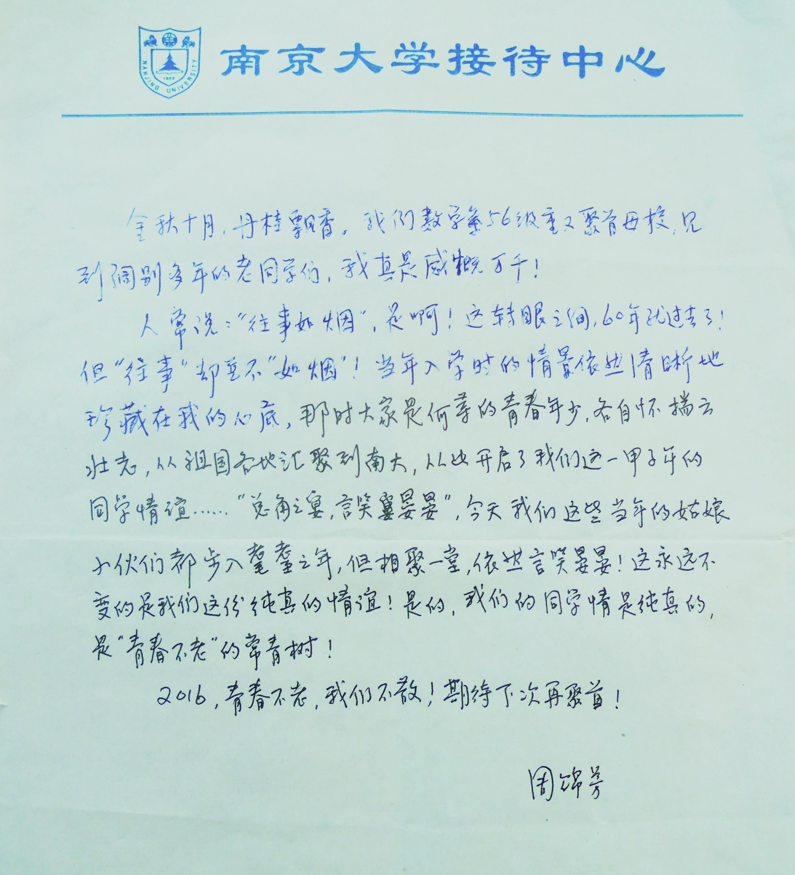 2016年10月17—19日南京大学数学系1956—1961级同学在母校举行了同窗六十周年纪念活动。来自加拿大·新疆·成都·沈阳·北京·深圳·上海以及浙·赣·苏·皖等省的同学45人,携家属14人,欢聚一堂,共叙同窗情谊和退休后的美好生活,交流养身保健经验。