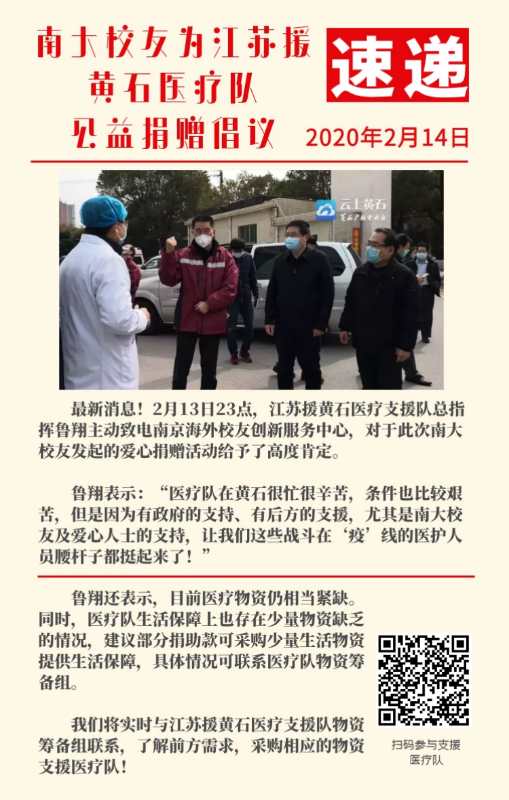 自2月11日江苏310名医疗队员驰援湖北黄石以来,从前方一线传来消息,目前支援队所需的部分医疗物资十分紧缺,特别是急需N95医用口罩、医用防护服等医用物资。为此,南大海外校友创新服务中心与南大南通校友会等单位,于2月14日,共同发起“守护我们的天使!南大校友支持江苏援黄石医疗队公益捐赠”活动,呼吁海内外校友积极行动,捐钱献物,同丹共济,共克时艰,战胜疫情。