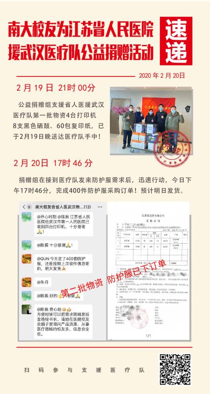 南大南通校友会紧急发动在南通的南大校友,积极响应号召,有力出力,有钱出钱、有物出物,奉献爱心,以实际行动支援前线抗疫战斗。几天来,“南大南通校友会群”和“南大人在南通”这两个群里,十分活跃,纷纷留言。校友倪烨说:“君住江之中,我住江之尾。同气且连枝,共饮一江水。瘟神不期至,并肩斗疫鬼。待至冬雪尽,笑迎春风回。”南通大学文学院教授、南大南通校友陈亮说:“天下兴亡,匹夫有责。任何人都无法独善其身。我们应当献上自己的爱心和力量,筑起一道抗击疫情的坚固长城。”在大家的共同努力之下,许多校友纷纷献上爱心。据组委会统计,截止2月20日,已经有537位校友认捐,总计103.5万元,其中南大南通校友会66位校友,总计捐赠了4.6万多元。至目前,组委会已经下单采购了口罩一万枚、防护服1140件、洗衣机20台、干洗机20台、打印机4台、打印纸60包等物资,近日将陆续送达江苏援黄石医疗队。