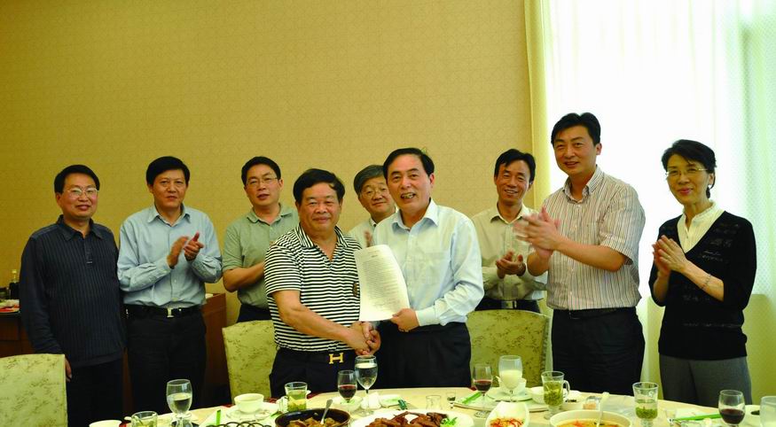 5月23日,福建福耀集团董事长曹德旺先生(中)访问我校。图为党委书记洪银兴(右)与副书记
