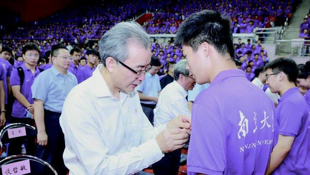 校徽佩戴仪式上,与会校领导和嘉宾为新生代表佩戴校徽。全体新生为自己佩戴上这枚象征着学校精神、学生身份的徽章,正式成为南京大学的一份子。