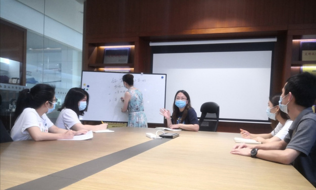 2001级广告系陈春萍校友(左二)研讨复工复产方案。