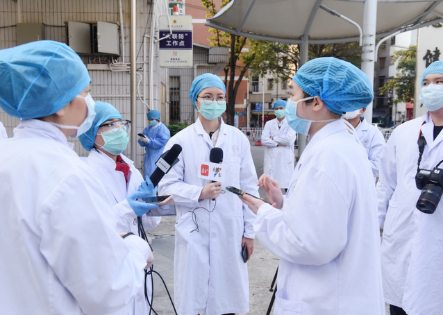 2010级新闻系廖钰娴校友(左三)在惠州市中心人民医院隔离病区采访。