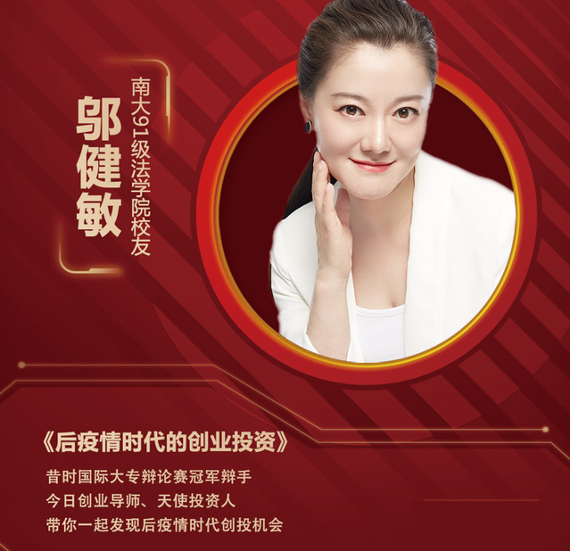 3.邬健敏师姐是南大91级法学院校友,作为当年国际大专辩论赛南大夺冠的四朵金花之一,邬师姐在校友心中是女神级的存在。邬师姐一直从事天使投资和初创企业的孵化工作,所以她的分享主要围绕新冠疫情下的创业和投资两方面展开。“时代的一粒灰,落在个人头上就是一座山。”邬师姐以这句话开头,给希望创业和投资的校友提供了满满的干货建议。
