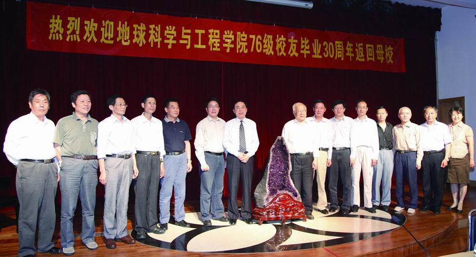 5月28日,地球科学与工程学院76级校友举行毕业30周年聚会。图为76级校友向母系赠送高1.5米、重300多斤的紫晶包。