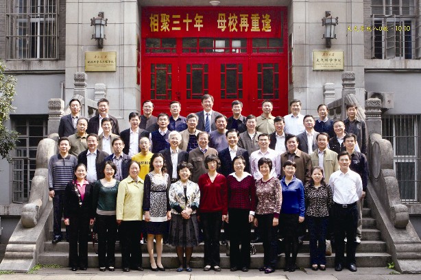 同学相聚,合影留念,共忆往事,叙友情,谈家事,畅想未来,暂时打破了楼前的平静。随着一声“茄子”,44张笑脸定格在底片上,心坎里!难忘的南大校园!难忘的美丽东南楼!难忘的30年前!难忘的30年后!