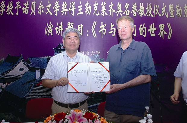 继美国女作家赛珍珠之后,又一位诺贝尔文学奖获得者“落户”南京大学——他就是被誉为“法兰西三星”之一的法国作家勒克莱齐奥。8月21日下午,授予勒克莱齐奥先生名誉教授仪式在南京大学鼓楼校区举行。在热烈的掌声中,南京大学党委书记、著名经济学家洪银兴教授为勒克莱齐奥先生佩戴上南京大学的校徽,勒克莱齐奥先生成为南京大学的一员。