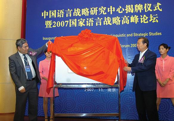 11月9日上午,中国语言战略研究中心揭牌仪式暨2007国家语言战略高峰论坛在我校逸夫馆报告厅举行。教育部赵沁平副部长、我校党委书记洪银兴共同为中心揭牌,并为该中心学术委员会李宇明等10名委员颁发聘书。同时,教育部语言文字信息管理司司长李宇明、江苏省教育厅厅长王斌泰为鲁国尧等中心学术委员会10名顾问颁发聘书。仪式由我校副校长张异宾主持。教育部语言文字信息管理司副司长王铁琨、我校校长助理周宪等出席了仪式。与会的还有来自德国曼海姆语言研究所、荷兰莱顿大学、北京大学、中国社会科学院、中央民族大学、复旦大学、上海外国语大学、