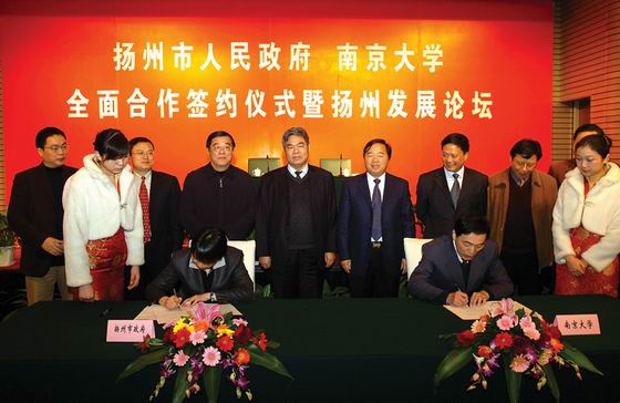 2006年12月29日,我校与扬州市人民政府签署了全面合作协议,这标志着南京大学与扬州这一历史文化名城的合作发展掀开了新的一页。陈骏校长与扬州市人民政府王燕文市长分别代表校府双方在合作协议上签字,我校党委书记洪银兴,扬州市市委书记季建业,扬州市委常委、常务副市长王荣平,我校副校长张荣,扬州市委副书记王军以及我校相关职能部门、院系负责人,扬州市有关单位的负责人等出席了签约仪式。扬州市委常委、常务副市长王荣平主持仪式。