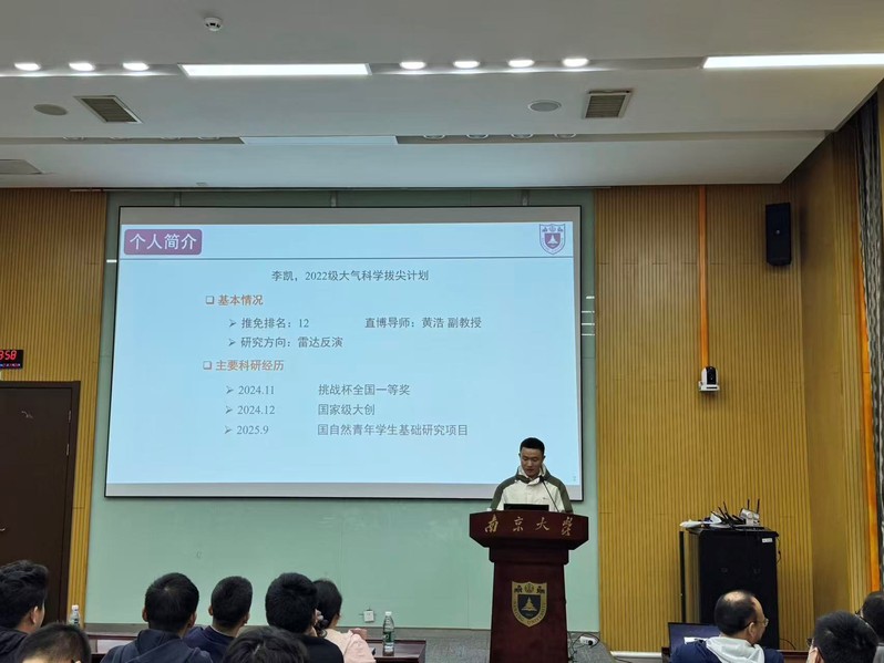 10月28日中午大气科学学院2024级大气科学拔尖计划师生集体见面会在院楼D103成功开展。党委书记林仕尧、院长赵坤、党委副书记王欢、副院长黄丹青及24级拔尖科研导师代表孙旭光、聂玮、胡海波、黄浩、蒋益荃、汤帅奇、李元龙、傅豪、刘奇等与拔尖计划学生开展积极交流,会议由拔尖班主任刘岩主持。针对刚就读仙林校区的大二拔尖班,刘岩老师详细介绍了学院大气科学拔尖计划的动态进出机制、本研衔接培养、学生激励机制。