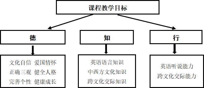 因此,在建设“视听说与跨文化交际”课程过程中,教学团队自觉将育人纳入课程教学目标,并在教学材料的选择与教学活动的设计上有意识地增强课程的育人功能。具体而言,课程教学目标可表述为“德、知、行”(即育人、传授知识、培养能力)“三元”目标:“知”主要包括英语语言知识、中西方文化知识与跨文化交际知识;“行”主要体现为英语听说能力和跨文化交际能力;“德”则包含文化自信与爱国情怀、正确三观(世界观、人生观、价值观)与健全人格、完善个性与健康成长等内容。
