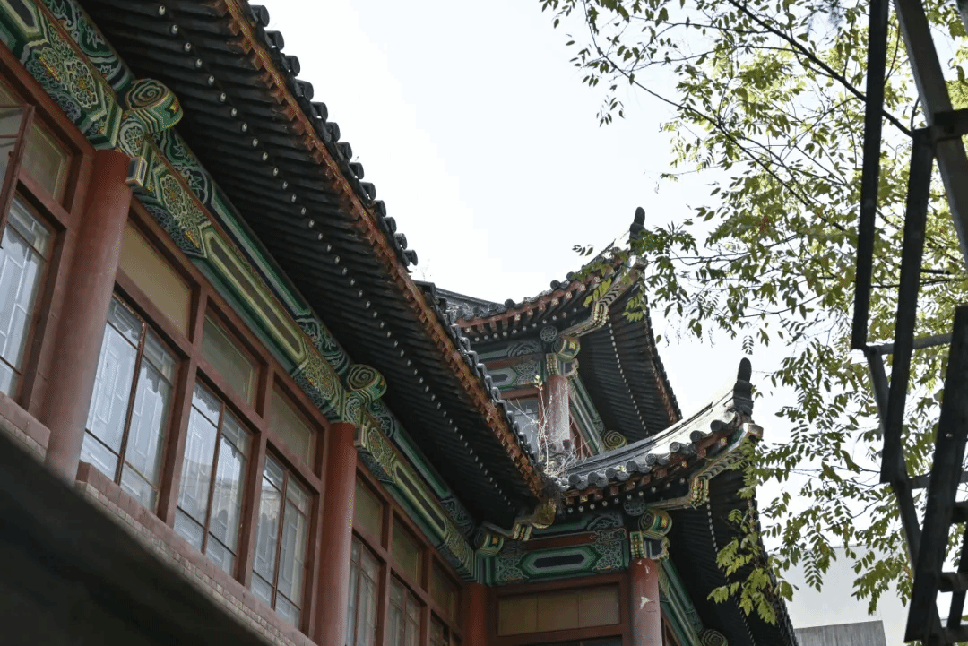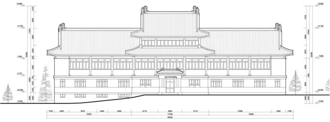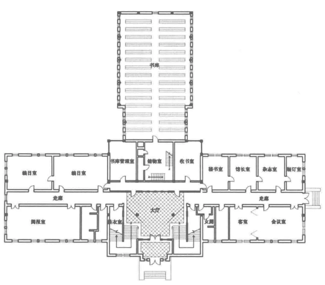 图书馆为钢筋混凝土结构,中三层、边两层,其中主楼采用的是重檐歇山屋顶,两侧辅楼为了体现形式秩序,采用单檐歇山顶。主入口有大理石门套,在北立面居中,在校园中轴线上与北大楼主入口遥相对应。一层立面为实墙上开竖向窗户,沉稳厚重,设有阅报室、会议室、书库管理室及其他办公用房,大厅入口处两侧有两个三跑楼梯通二层。二层大面积开窗,通透轻盈,采光通风好,便利阅览;其大厅为借书处,两侧设阅览室。