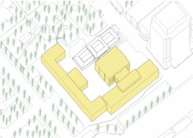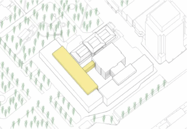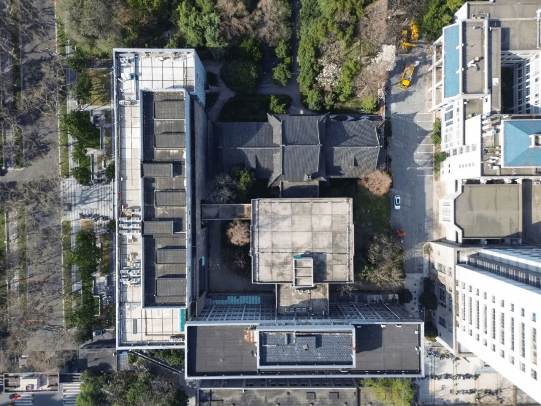 上世纪七十年代,原金陵大学图书馆已经无法满足南京大学教学科研的规模要求,校方启动扩建工程,在八十年代建成了1.95万平方米的新馆。由于场地、限高等多因索限制,本次扩建的部分是围绕旧馆的西侧与南侧呈“L”型布置,南侧为主楼、西侧为辅楼、通过中部的书库进行形体连接。图书馆的扩建一方面扩充了内部使用空间,另一方面通过增加西侧辅楼的体量,与校园新中轴中大路另一侧的物理楼相呼应,使得新轴线得到了强化。