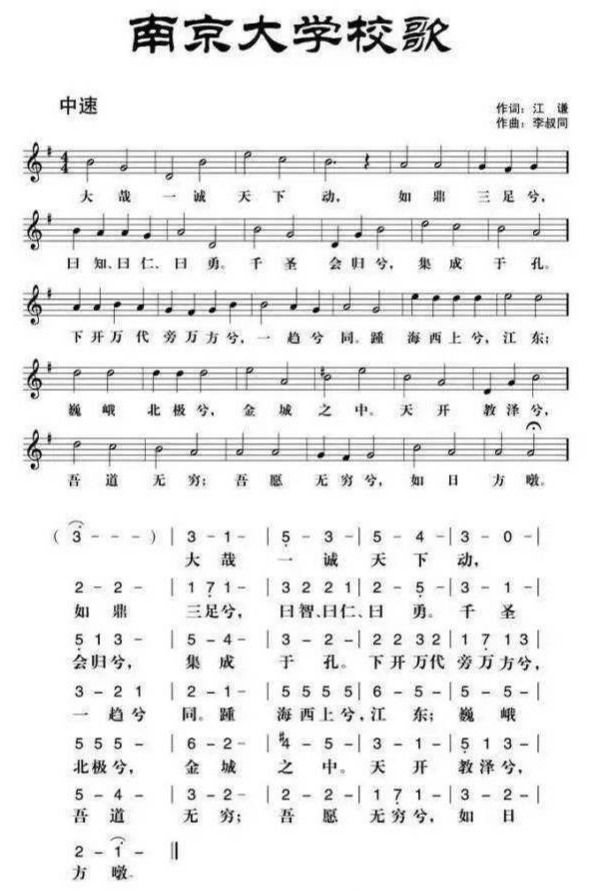 该校歌创作于1916年,是原南京高等师范学校的校歌,由南京高等师范学校音乐图画教师,中国近代著名音乐家、美术教育家、书法家、戏剧活动家李叔同先生制谱;南京高等师范学校首任校长、近现代著名教育家江谦先生作词。2000年后正式确立为南京大学校歌。