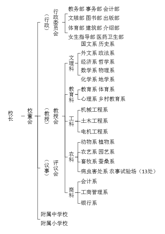学校行政组织系统共设下列11部:教务部、事务部、会计部、文牍部、图书部、出版部、体育部、女生指导部、医药卫生部、建筑部、介绍部。各部设主任1人,由校长聘请。各部职员也由校长聘请。