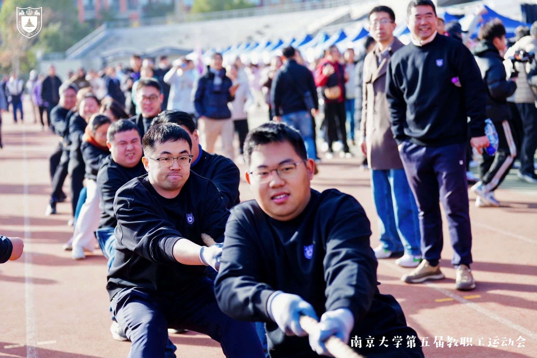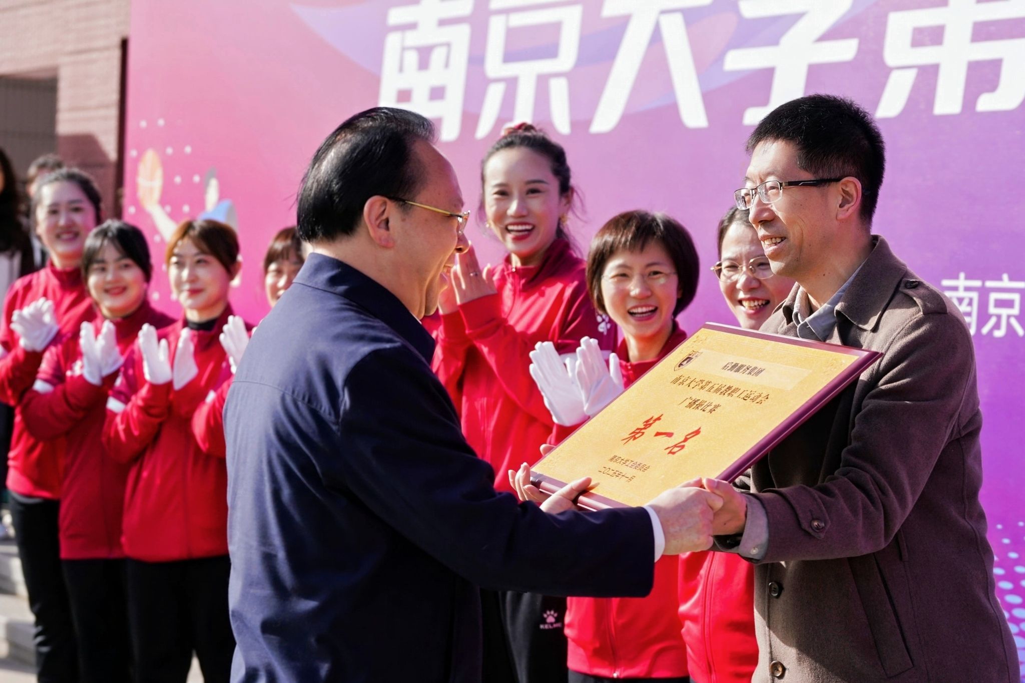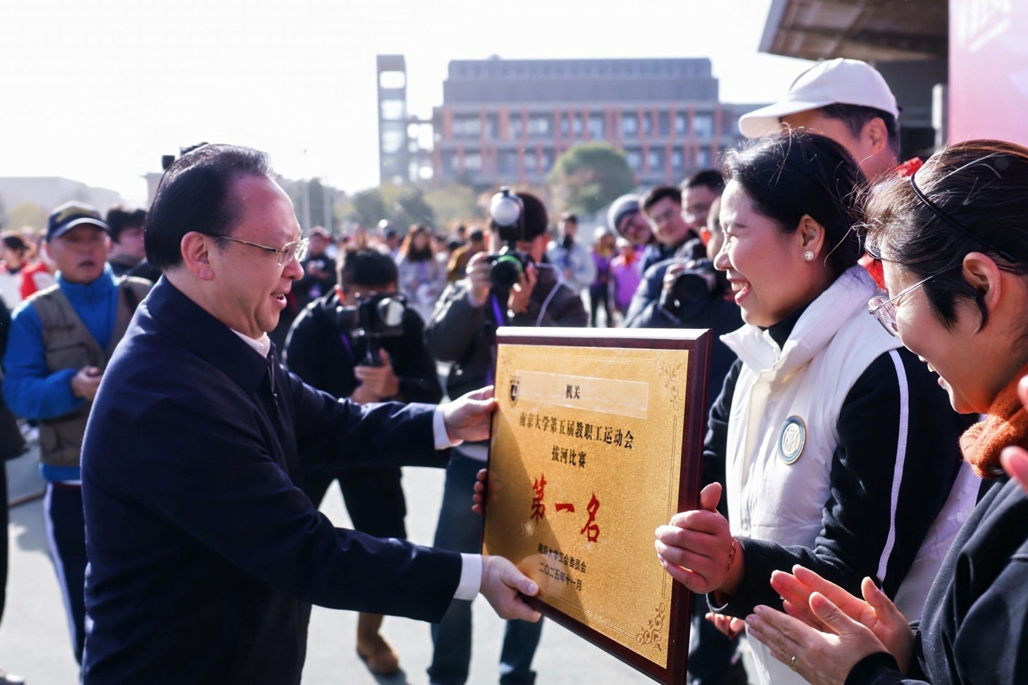 After a whole day of fierce competition, the Administration Sub-union won first place in the overall team score. The Sub-union of the School of Chemistry and Chemical Engineering and the Logistics Service Group Sub-union won second and third place, respectively. The Administration, School of Chemistry and Chemical Engineering, and College of Engineering and Applied Sciences won the top three places in the tug-of-war competition. The Logistics Service Group, Administration, and College of Engineering and Applied Sciences won the top three places in the broadcast gymnastics competition.