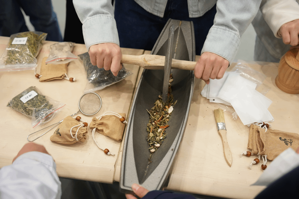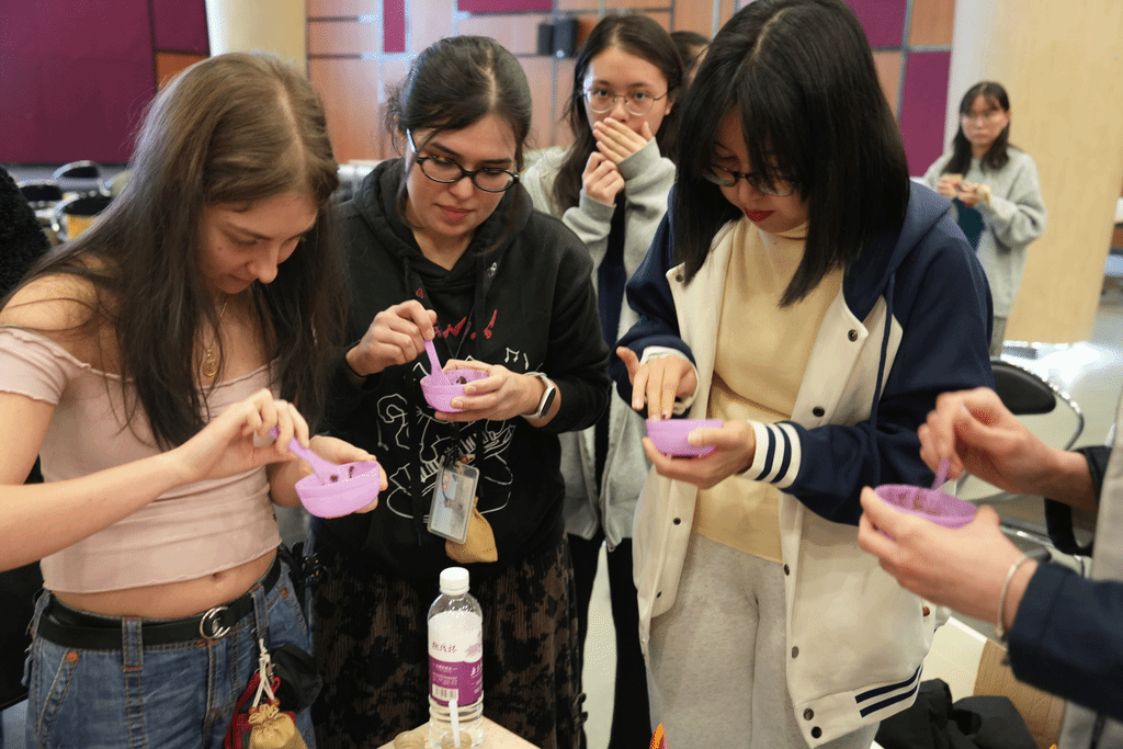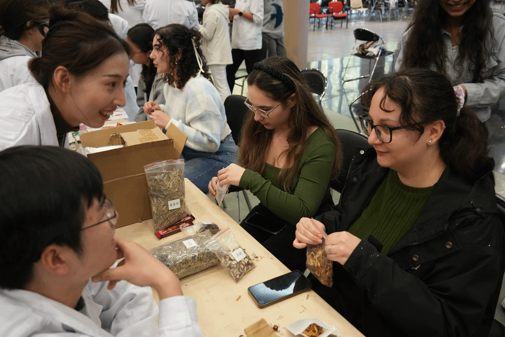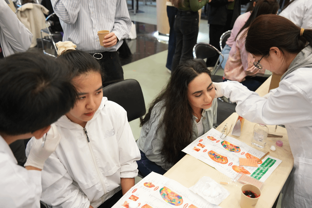 Subsequently, the venue transformed into a vibrant exploration space, featuring four interactive zones. In the Sachet-making zone, participants crafted personalized aromatic sachets using herbs such as mugwort and chrysanthemum. At the Herbal Tea Tasting station, participants brewed and sampled various herbal teas such as rose, goji berry, and cassia seed teas, experiencing firsthand their soothing and rejuvenating effects. At the Auricular Seed Therapy station, participants experienced this unique TCM technique, in which tiny seeds are placed on specific ear points to promote relaxation and balance. Meanwhile, the Handmade Incense Plaque activity engaged students in creating fragrant plaques from herbal blends, combining artistic expression with traditional health practices.