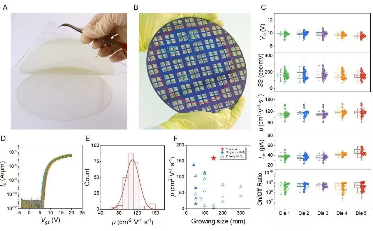 Recently, the research group led by Wang Xinran from the School of Electronic Science and Engineering at Nanjing University has made breakthroughs in the field of manufacturing technology for wafer-scale single-crystal two-dimensional (2D) transition metal dichalcogenides (TMDCs) semiconductors. The team developed a lanthanum-passivated sapphire substrate, enabling the epitaxial growth of 6-inch single-crystal MoS2, WS2, WSe2, and MoSe2wafers via metal-organic chemical vapor deposition (MOCVD). Wafer-scale spectroscopies and device measurements demonstrate the exceptional quality and uniformity, with average mobilities of 110 cm²·V⁻¹·s⁻¹ for n-MoS2and 131 cm²·V⁻¹·s⁻¹ for p-WSe2, respectively. This work fundamentally addresses the long-standing challenge of scalable single-crystal TMDC production, marking a critical step toward their industrial application in next-generation electronics.