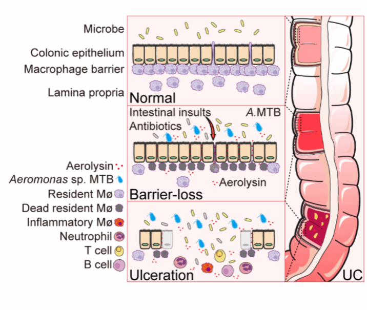An Aeromonas variant, MTB, promotes susceptibility to ulcerative colitis (UC) by disrupting colonic macrophages.