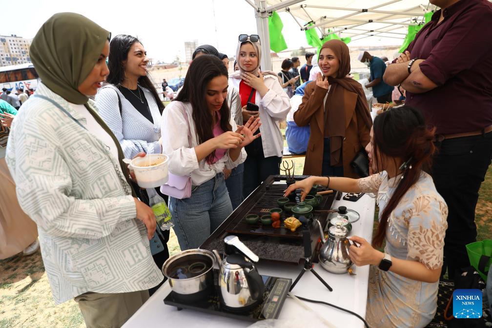 Egyptian students taste Chinese tea during a ceremony to celebrate Chinese Language Day in Cairo, Egypt, April 27, 2024. Students studying in Egyptian colleges celebrated Saturday the United Nations Chinese Language Day with a themed event featuring a concert, food and tea tasting, sketch comedy, and art show. (Xinhua News Agency/Ahmed Gomaa)