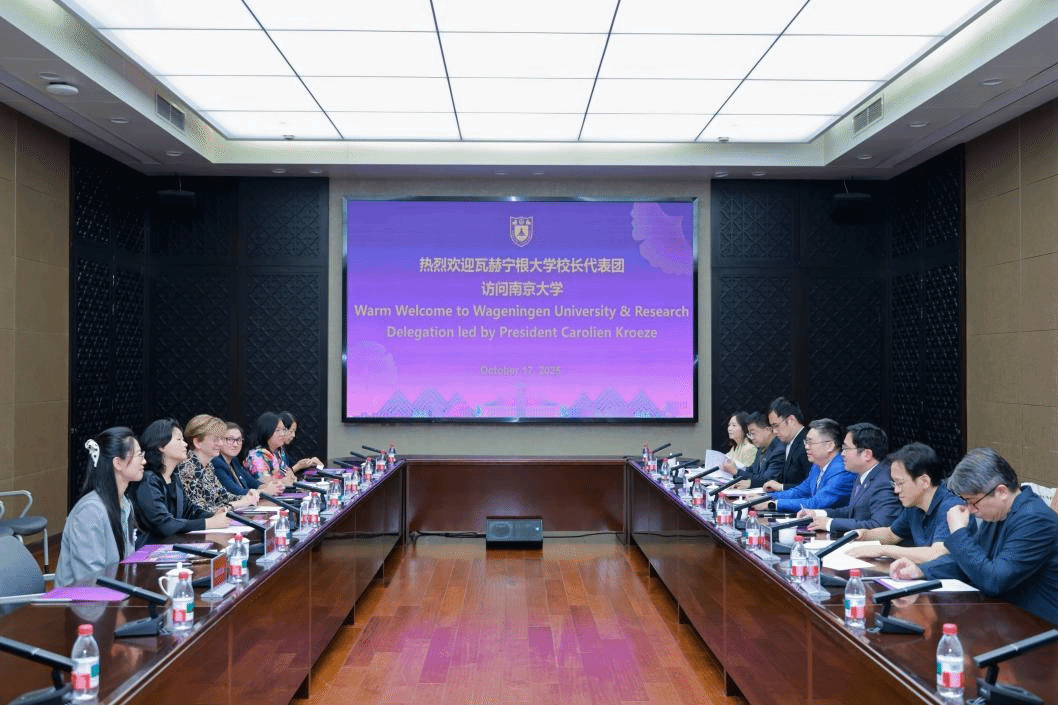 On October 17, a delegation from Wageningen University & Research led byCarolien Kroeze,President and Vice Chairman of the Board, visited Nanjing University. Tan Zhemin, President of NJU and Academician of the Chinese Academy of Sciences, met with the Wageningen delegation on Xianlin Campus to discuss practical measures to deepen cooperation.