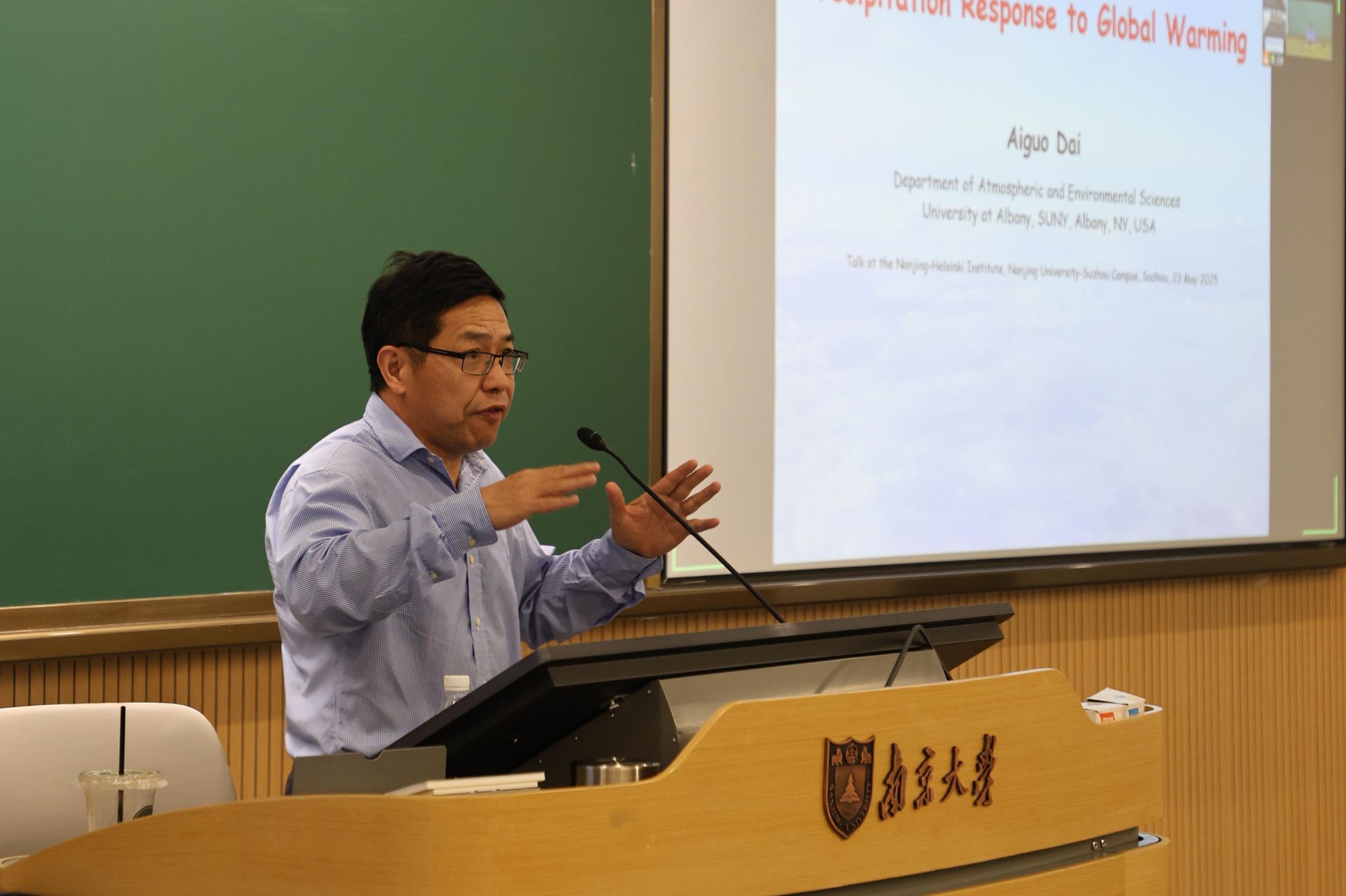 On the afternoon of May 23, the Nanjing-Helsinki Institute Lecture Series at Nanjing-Helsinki Institute in Atmospheric and Earth System Sciences, Nanjing University (NJU Nanjing-Helsinki Institute) officially commenced on Suzhou campus, with a branch venue set up at the Xianlin campus simultaneously. The inaugural lecture focused on frontier topics in "Atmospheric and Earth System Sciences," featuring keynote reports by foreign academician of the Chinese Academy of Sciences (CAS), Chen Deliang, and American climate scientist Dai Aiguo. The event was hosted by Ding Aijun, Assistant President of NJU and Dean of Nanjing-Helsinki Institute. Fu Congbin, Academician of the CAS attended online.