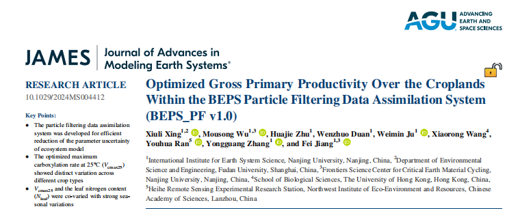 Xing, X., Wu, M., Zhu, H., Duan, W., Ju, W., Wang, X., et al.(2025). Optimized gross primary productivity over the croplands within the BEPS particle filtering data assimilation system (BEPS_PF v1.0). Journal of Advances in Modeling Earth Systems, 17, e2024MS004412. https://doi.org/10.1029/2024MS004412.