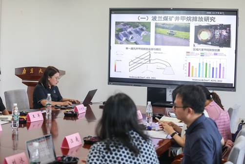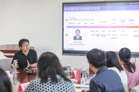 双方首先介绍了各自团队的成员。居为民教授对来访客人表达了热烈欢迎和对双方开展研究合作的期待,并介绍了国际地球系统科学研究所的情况。随后,江飞教授介绍了碳同化系统研发总体情况,何维博士介绍了基于站点和卫星的区域碳源汇反演,冯树状博士介绍了污碳协同的人为源碳排放反演,李季博士介绍了温室气体监测。在报告交流后,刘冰主任介绍了总站的情况和目前正在开展的“双碳”主题方向的研究和业务工作。双方对相关方面的问题进行了热烈深入的探讨。