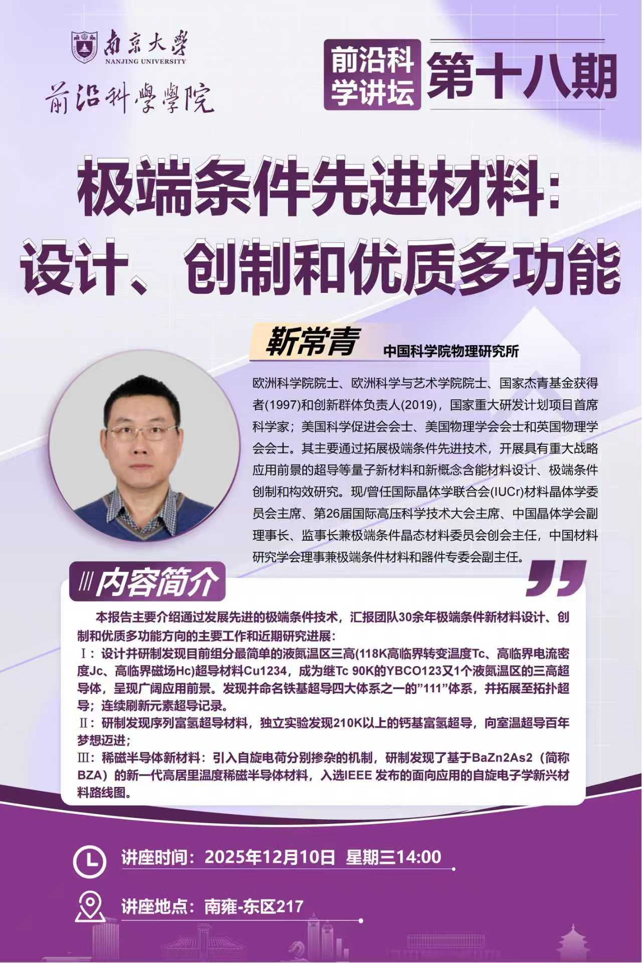 讲座题目:极端条件先进材料:设计、创制和优质多功能