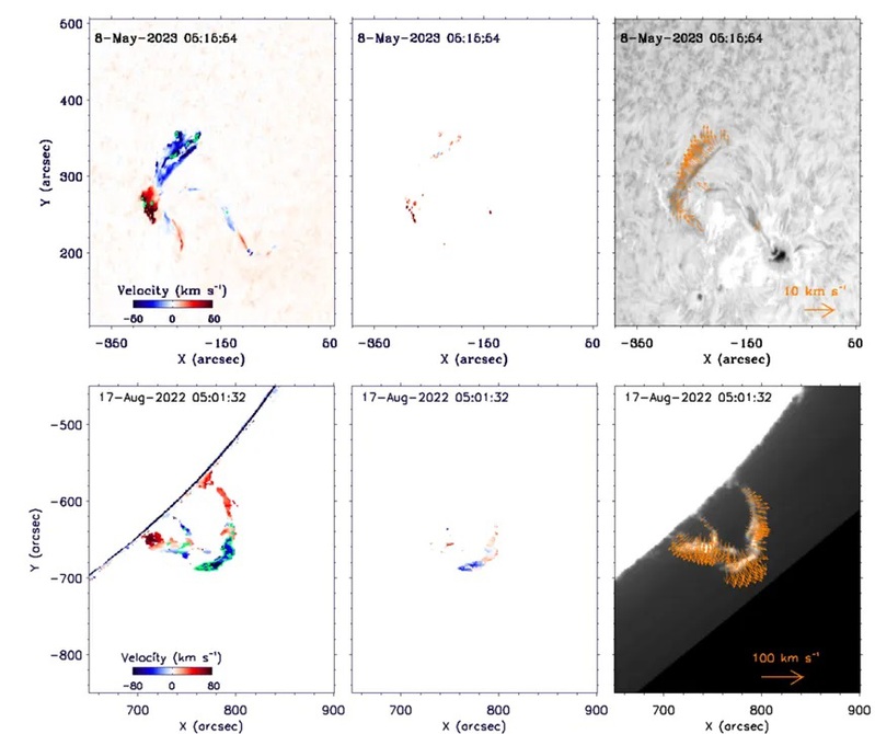 图2. 爆发暗条(上图)和日珥(下图)的三维速度场