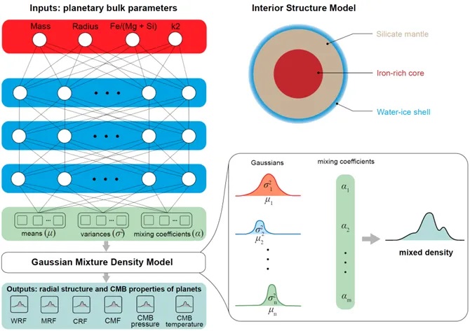 图1. 混合密度神经网络模型和岩石行星内部结构模型示意图