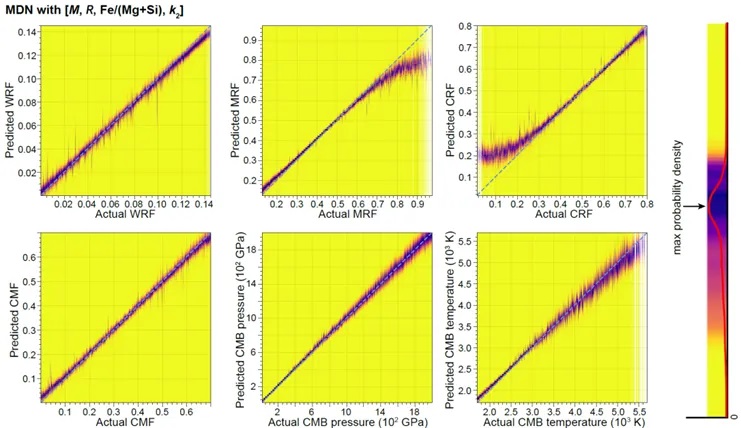 系外行星探测的主要目标是发现恒星周围的行星并认识它们的大气和内部结构,搜寻可能适宜人类居住的行星。前沿科学学院深空探测科学与技术研究院的倪冬冬教授和澳门科技大学月球与行星科学国家重点实验室合作,基于机器学习模型——混合密度神经网络(图1),根据行星的质量、半径和其他可能的重要观测(例如恒星光谱、潮汐效应等),训练了多个机器学习模型,来推断成分迥异的岩石系外行星内部结构。从图2可以看出,通过输入行星质量和半径、耐热元素丰度Fe/(Mg + Si)、以及潮汐洛夫数,机器学习模型可以很好的预测行星的内部结构,使得科学家们能够更好地理解行星的内部特性,包括核心所处的热力学环境、幔层厚度和可能的水冰含量。