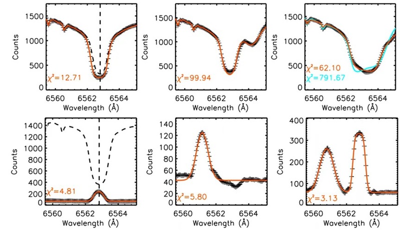 图1. 爆发暗条(上图)和日珥(下图)的Hα谱线轮廓