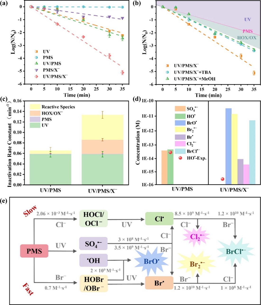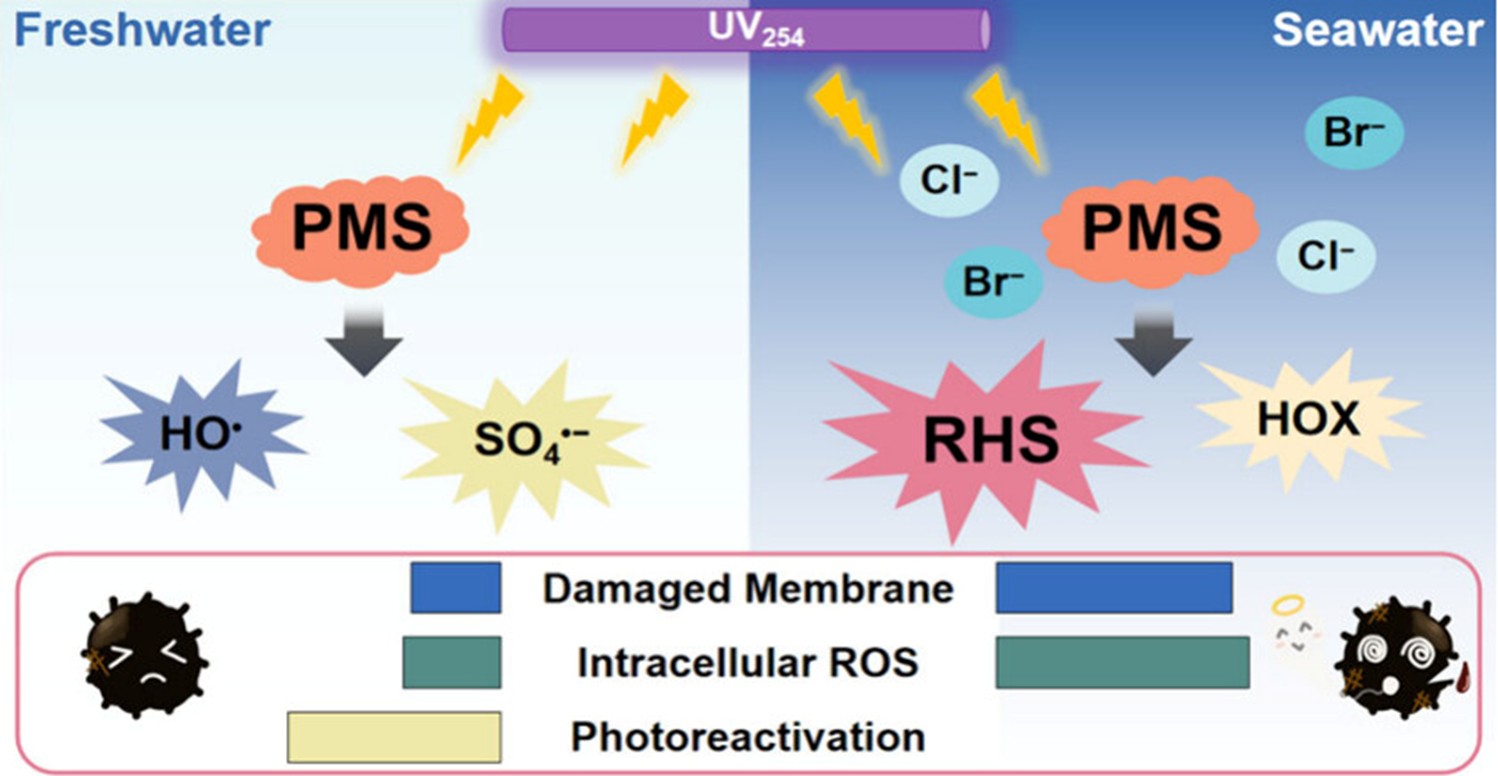 近日,南京大学前沿科学学院环境与健康研究院殷冉副教授报道了一种利用紫外线活化过一硫酸盐(UV/PMS)工艺在海水中高效灭活真菌孢子的新方法。研究结果表明,在50 μM PMS、84 mJ cm⁻2的紫外剂量的条件下,海水中的UV/PMS工艺可实现黑曲霉孢子5.11-log的完全灭活,而淡水体系中仅能达到2.45-log灭活效果。本研究首次揭示了海水中卤素离子的关键增效作用。卤素离子会被紫外高级氧化体系转化为活性卤素物种(RHS,如BrO•、Br₂•–、BrCl•–),其对灭活的贡献占比达35.5%,远高于UV/PMS工艺中SO4•–和•OH等活性物种10%的占比。RHS能破坏真菌孢子的细胞膜结构(超55%膜损伤)、损伤内部细胞器,并有效抑制孢子光复活(处理后孢子存活率仅轻微上升0.55%)。在实际应用中,该工艺在真实海水和合成海水中的灭活效率分别是去离子水的2.2倍和3.0倍,且与UV/氯工艺相比,产生的消毒副产物总量低2.1倍。该研究深入阐明了咸水环境中RHS的生成机制及其在真菌孢子灭活中的作用,为UV/PMS工艺在海水相关领域(如压舱水处理、海水冲厕系统)的工程应用提供了重要理论依据。