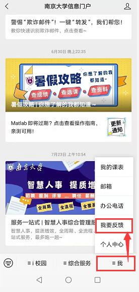 或者,关注微信“南京大学信息门户”后点这里:“我”、“我要反馈”,如下图: