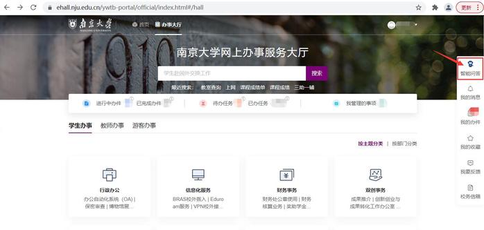 在浏览器中输入网址:http://ehall.nju.edu.cn,进入南京大学“网上办事服务大厅“,可以在侧边栏找到“智能问答”。