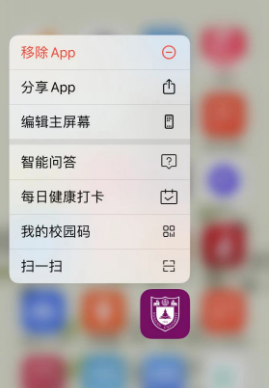 无需打开南京大学APP,只要在手机桌面长按“南京大学APP”图标,即可出现“扫一扫”、“我的校园码”、“每日健康打卡”、“智能问答”快捷入口。