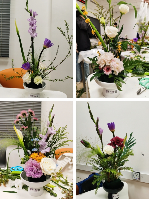 随后,同学们进行自主创作。大家根据老师讲解的插花原则,以马蹄莲和睡莲作为主花,搭配小菊、洋桔梗、唐菖蒲、蓝星花等花卉绿植,动手裁切、修剪、调整、定型。经过一番精心创作,一盆盆造型各异、富有美感的插花艺术作品相继完成,每一件作品都承载着同学们对廉洁理念的理解与诠释。