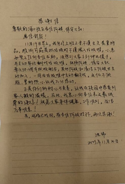 “当我看到阿姨们在垃圾堆中翻找,不顾脏累的热心让我万分感动。”沈同学在感谢信中写道:“是你们的耐心与负责,让我在校园中感受到家人般的温暖。”