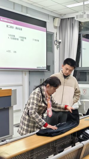 随后,后勤服务集团国际会议中心苏月英经理、林爱民主管化身讲师,向同学们系统讲解“六常管理理念”,并结合实践经验,手把手演示衬衫、羽绒服、T恤衫、毛衣等衣物的高效折叠法与物品分类收纳技巧。走进学生宿舍,针对镜面水清清理、台面物品归置、卫生间深度保洁、洗涤用品安全存放等高频需求,后勤师傅们现场演示清洁工具使用方法与高效清洁流程,让学生在实操中掌握生活技能。