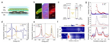 针对这一难题,王欣然教授团队基于此前发现的超强光响应Me-PTCDI单层有机分子晶体(Nat Commun 10, 5589 (2019)),成功构建了以Me-PTCDI为供体、WS₂为受体的新型二维有机/无机杂化异质结构。该结构充分利用有机分子在分子水平上的化学可调性与局域Frenkel激子所具有的强振子强度和高荧光量子产率等优势,通过精确匹配供体Frenkel激子与WS₂的2s暗激子能级,借助Dexter电子交换机制实现了高效共振能量转移。实验结果显示(图1),异质结中WS₂的光致发光强度最高增强达到124倍,且具有偏振特性,创下了同类报道的最高记录。理论计算进一步表明,得益于减小的层间距和受体2s激子态的空间离域特性,其ET速率较传统无机异质结构提升了一个数量级。