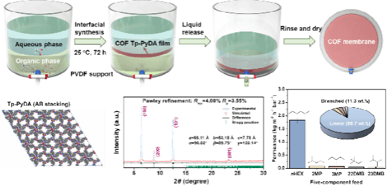 近日,杨昊副教授报道了一种分子选择型超微孔COF膜材料,通过COF膜有机溶剂反渗透过程实现了C6烷烃异构体的高效分离。主要创新点包括:(1)通过设计二维COF膜的AB堆叠,制备了具有4.5 Å超微孔径的COF膜,实现了C6烷烃异构体的高效分离。(2)通过实验表征和密度泛函理论(DFT)计算,揭示了COF膜与C6烷烃异构体之间的分子相互作用机制。(3)与传统聚合物膜相比,该COF膜在12 bar的操作压力下即可实现高效分离,压力降低了3-5倍,大幅降低了能耗。(4)COF膜在连续40小时的分离实验中表现出稳定的性能,有效提高了C6烷烃混合物的RON值,展示了其良好的实际工业应用前景。