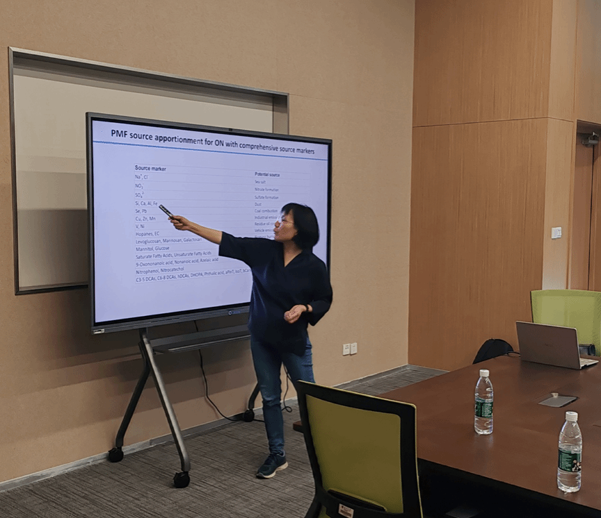 郁建珍教授本次报告主要介绍了该团队在气溶胶中有机氮总量测量方面的研究进展。在报告中,郁建珍教授介绍了气溶胶的环境影响、有机氮的来源及重要性,指出了有机氮难以被精确定量的现状。通过与当前有机氮测量方法的对比,郁建珍教授向在座师生展示了该团队开发的气溶胶氮分析仪的优势,解决了无法精确测量气溶胶中有机氮的难题,首次揭示了大气气溶胶中含氮分子的显著贡献。