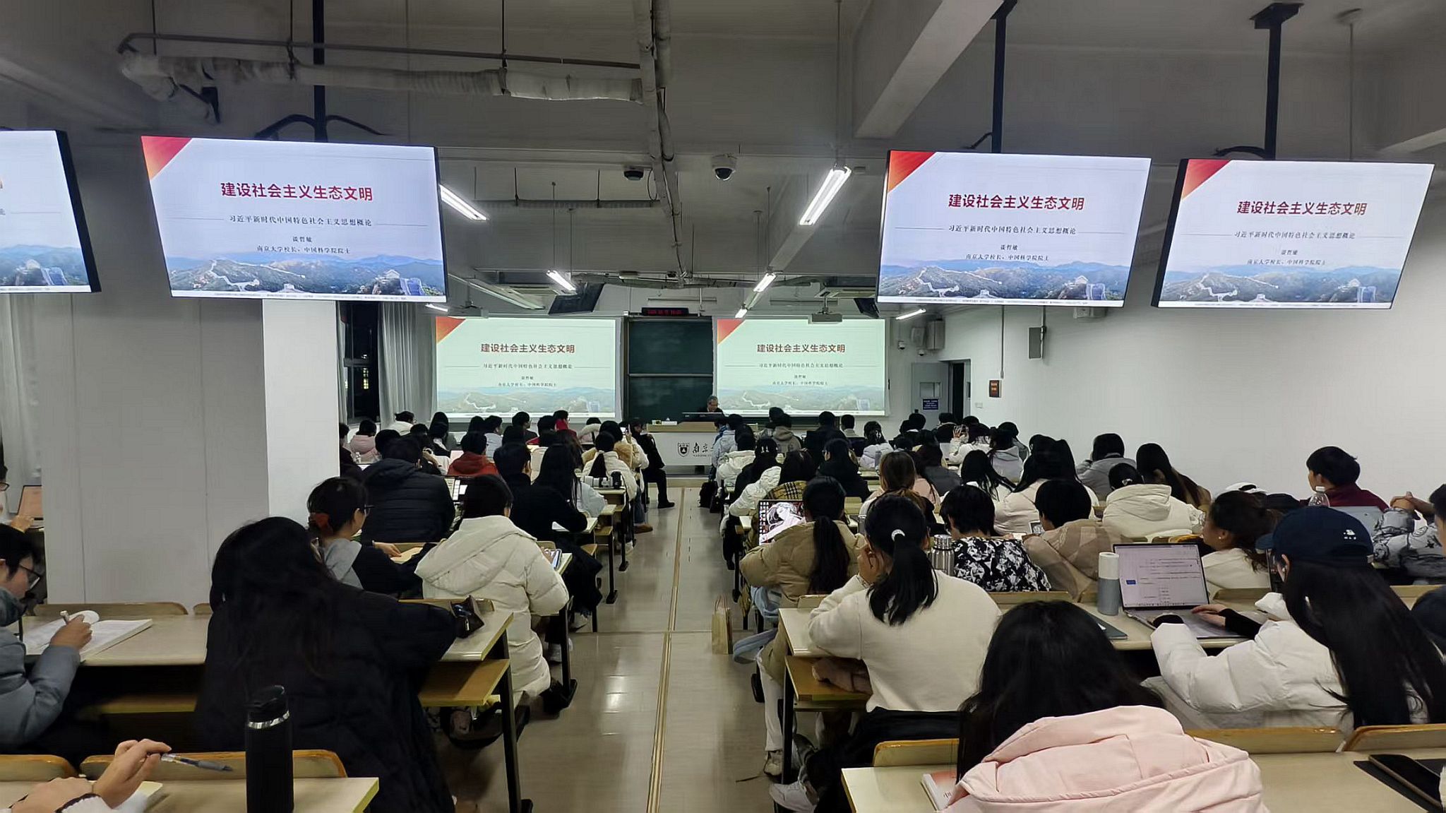 习近平生态文明思想是习近平新时代中国特色社会主义思想的有机组成部分,具有中华民族伟大复兴和人类文明进步两大维度,体现了文明高度、哲学科学深度、历史广度。进入新时代以来,在以习近平同志为核心的党中央强有力推动下,我国形成了人与自然和谐共生的中国式现代化建设格局,生态文明建设从理论到实践都发生了历史性、转折性、全局性变化。课堂上,谈哲敏引导同学们从人类文明的高度增强对习近平生态文明思想丰富内涵的深刻领悟,进一步思考为什么建设生态文明、建设什么样的生态文明和怎么建设生态文明。