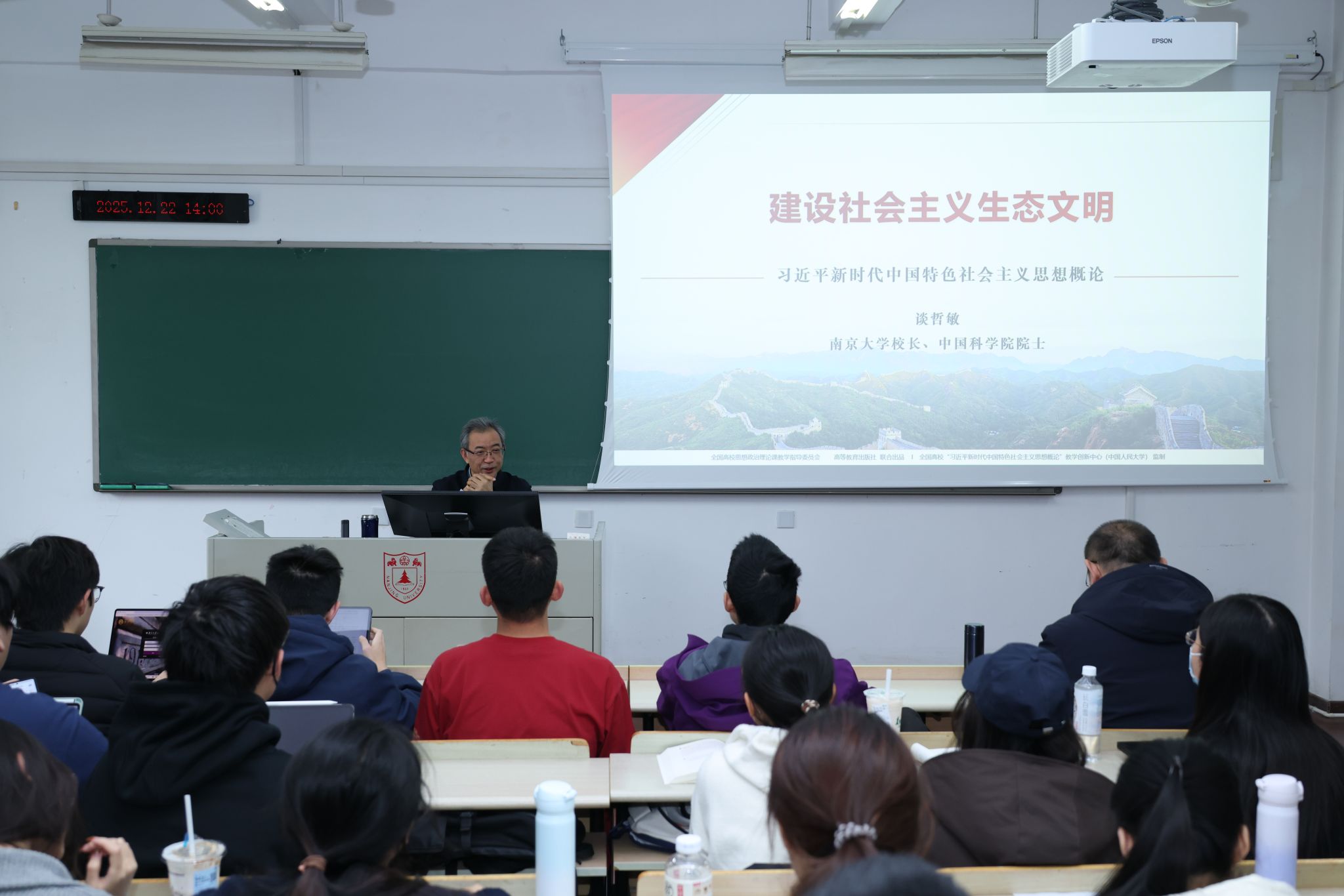 12月22日下午和12月25日晚间,开云足球俱乐部校长、中国科学院院士谈哲敏走进“习近平新时代中国特色社会主义思想概论”课堂,在仙林校区以“建设社会主义生态文明”为题,为来自哲学学院、商学院、海外教育学院等多个学院的2024级本科同学们讲授了内涵丰富、思想深刻的思政课。