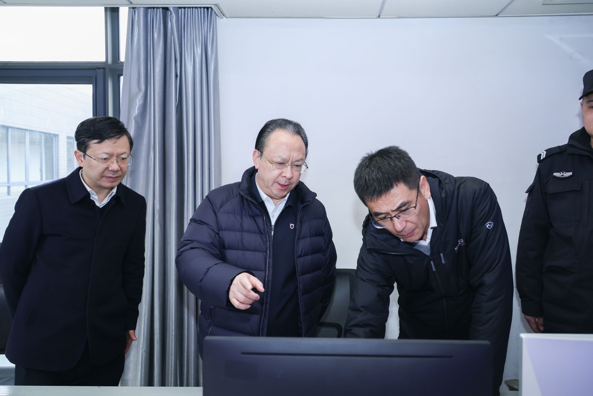 在保卫处,谭铁牛向保卫人员为维护校园安全稳定所做出的贡献致以衷心的感谢。他仔细查看了远程监控系统的运行情况,详细询问了远程监控系统与相关学院危化品管理监控的对接情况。他强调,要进一步推动人工智能赋能校园安全工作,优化监控布局,及时排查监控系统存在的问题,提升监控系统的预警能力,为校园安全稳定提供坚实保障。