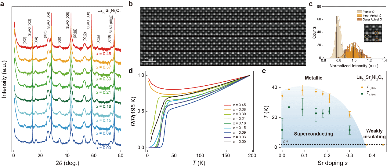 聂越峰教授课题组长期致力于发展基于氧化物分子束外延(OMBE)的单原子层精度可控的薄膜制备技术,并将其应用于铁电、多铁及高温超导等量子材料研究中。本研究基于团队在OMBE技术方面的长期积累,通过反射高能电子衍射(RHEED)原位实时监测与X射线衍射表征相结合,建立了高精度化学计量比校准与掺杂调控方法,并采用改进的逐层沉积工艺,制备出高质量Sr掺杂La₃Ni₂O₇薄膜,并成功观测到高温超导态。