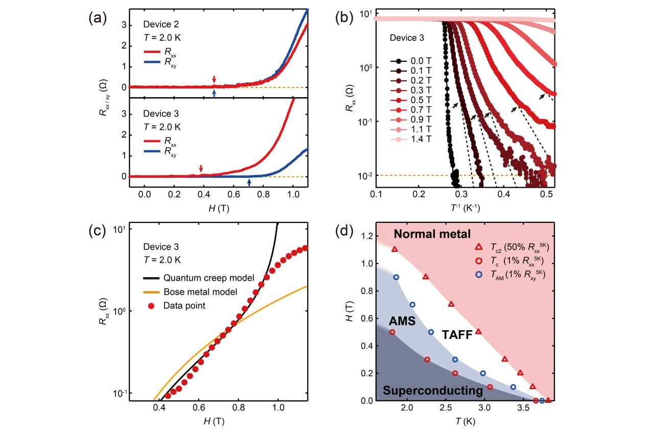 研究团队比较了不同样品厚度和磁场作用下纵向电阻(Rxx)与霍尔电阻(Rxy)的演化,深入探究维度调控下的超导性以及反常金属态。首先在厚层样品中(器件2,厚度14.5nm),Rxx和Rxy在0.42T磁场条件下同时变为有限值,表明在整个磁场变化过程中不存在反常金属态(图2(a)上)。而对于器件3(厚度为9.4nm),Rxx在0.4至0.65 T磁场范围内保持明显的有限值,而Rxy消失,表明反常金属态的出现(图2(a)下)。当温度降至特征温度 Tcross(图2(b)黑色箭头所示)时,R-T曲线开始明显偏离阿伦尼乌斯(Arrhenius)型拟合(图中黑色虚线)。这表明在反常金属态向正常金属态过渡过程中,样品会经历由热激活磁通运动(Thermally activated flux flow, TAFF)主导的区域;而偏离 Arrhenius 行为则意味着 TAFF 模型不再适用,耗散机制发生了改变。团队进一步探究了2K下Rxx的磁场响应特性,发现其变化规律符合量子蠕动模型,暗示着反常金属态由涡旋的量子蠕动过程所驱动。基于器件2的实验结果,构建了磁场与温度的变化相图,表现了超导态、反常金属态及正常金属态之间的转变过程,说明样品厚度在介于三维和二维之间时,基态虽然仍为超导,但通过磁场作用可激发出反常金属态。