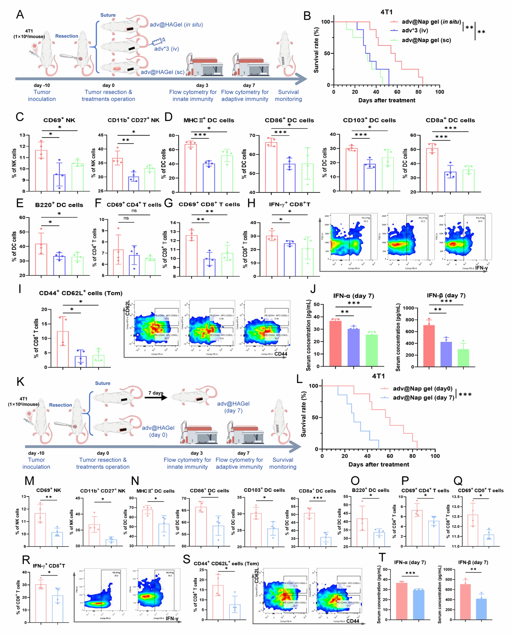 紧接着,为了探讨adv@Nap gel抑制肿瘤术后复发和延长生存期的机制,团队分析了adv@Nap gel治疗小鼠的免疫反应。流式细胞术和免疫组化结果证实,始于术中原位放置adv@Nap gel可显著激活先天免疫和适应性免疫应答,诱导长期和肿瘤抗原特异性免疫应答,同时诱导持久的免疫记忆,最终抑制肿瘤术后复发和转移。